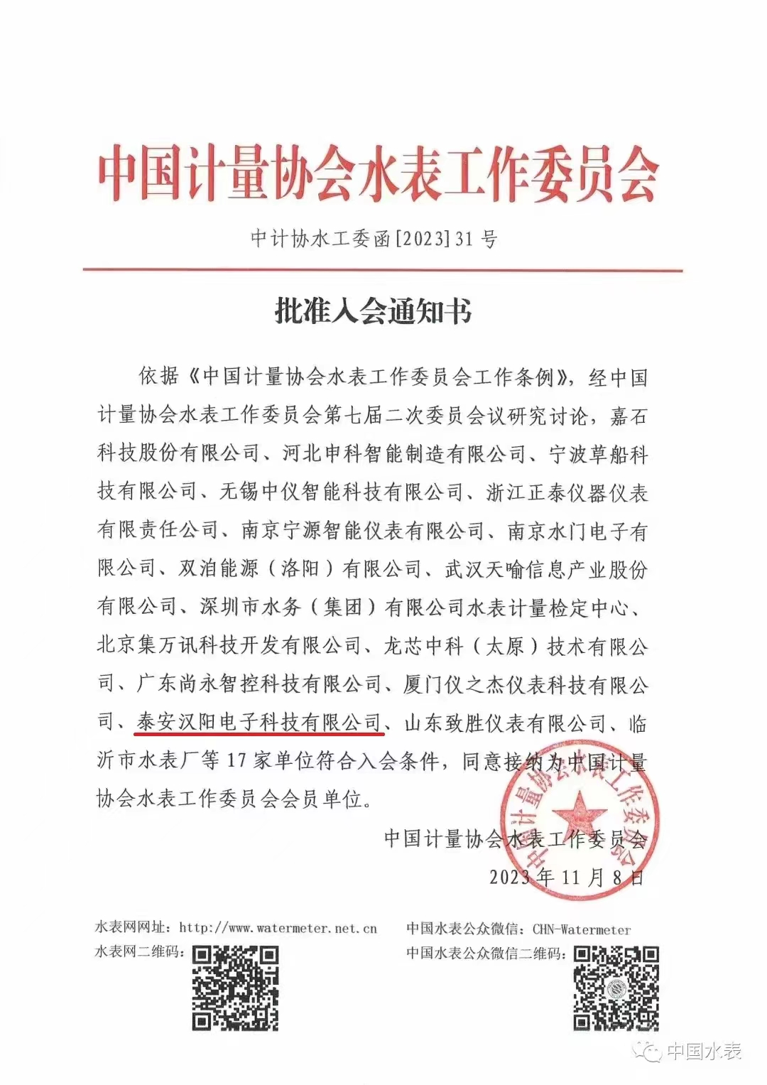 泰安漢陽加入中國計量協會